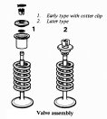 e) Ensure that the valve stem is not damaged by the spring retainer when compressing the valve spring, and that the split tapered collets engage correctly in the valve stem and spring retainer when the spring is released. Refit the spring clip to the collet, where applicable.