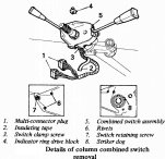On late models, the combined steering column switch incorporates the direction indicators, headlamp dip/flash and horn on the right-hand side of the column, and the windscreen wipe/wash switch on the opposite side. The switches are incorporated on a single mounting plate but the individual switch on either side can be replaced separately if required.